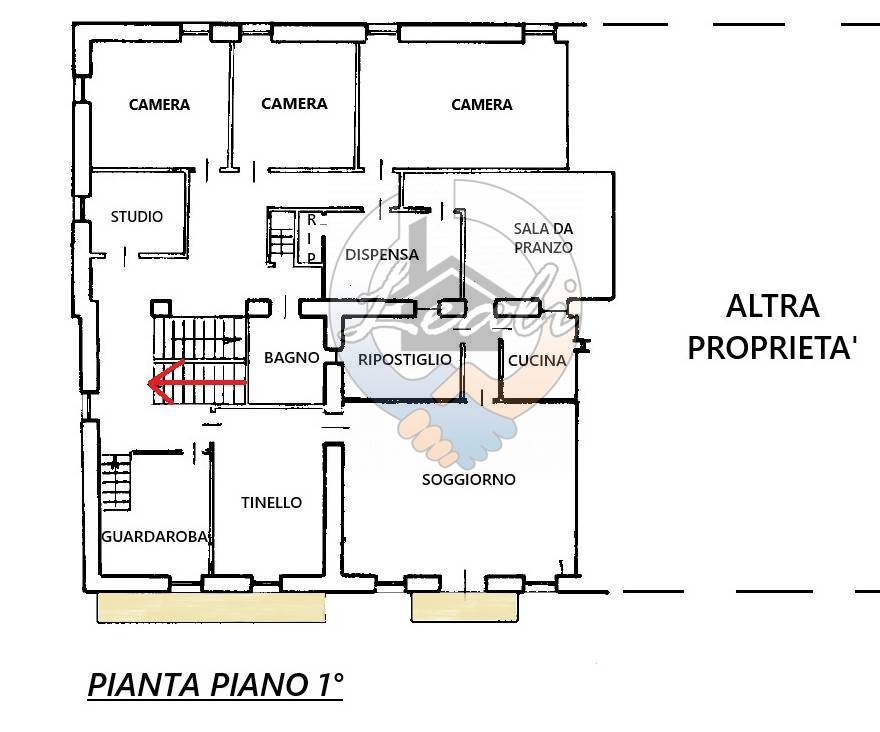 - Piano primo (283 mq): prestigioso appartamento principale con numerosi ambienti giorno, studio, cucina, sala da pranzo, tre camere e spazi accessori